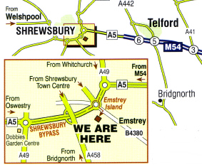 It is located near the Shrewsbury A5 bypass. At the Emstrey Island Roundabout exit onto the B4380 heading towards Emstrey (follow the brown Attingham Park signs) Postcode for GPS use: SY5 6QS